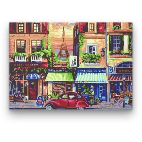 Autó Párizsban - számfestő készlet – 40×50 cm (Keret nélkül) Ez a festmény egy varázslatos párizsi utcakép hangulatát idézi meg, amely romantikus nosztalgiával tölti el a nézőt. Egy történet bontakozik ki, ahol az utcák élettel telnek meg, mintha csak egy