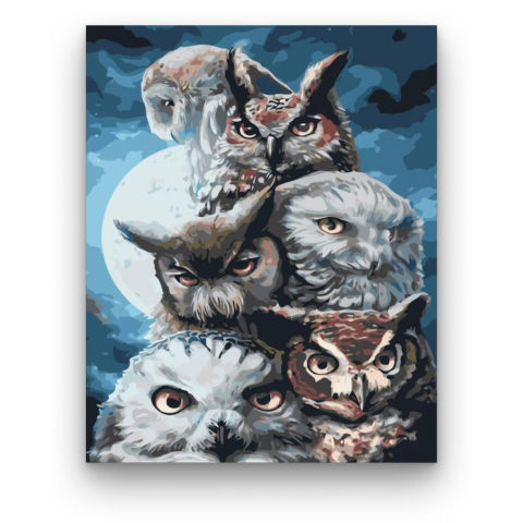 Bagoly banda - számfestő készlet – 40×50 cm (Keret nélkül) A festmény misztikus, éjszakai hangulatot áraszt, amely elvarázsolja a nézőt. A bagoly banda titokzatos történetet mesél, ahol minden tekintet egy újabb titkot rejt. A hideg kékek és szürke árnyal