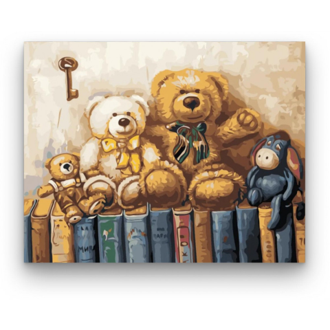 Barátok a könyvespolcon - számfestő készlet – 40×50 cm (Keret nélkül) A kép melegséget és nosztalgiát áraszt, mintha egy gyermekkori emlék elevenedne meg. A könyvespolc tetején ülő plüssállatok csendes barátsága mesél az idő múlásáról és a megőrzött ártat