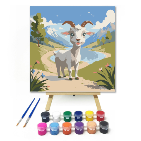 Boldog kecske baby - gyerek számfestő készlet – 20×20 cm (Keret nélkül) Ez a kép egy boldog kis kecskegidát mutat, aki vidáman sétál a hegyekkel ölelt réten. A színes virágok és a kék ég játékos hangulatot teremtenek. Tökéletes választás a gyerekek első f
