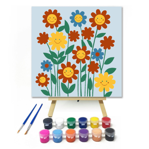 Boldog virágmező - gyerek számfestő készlet – 20×20 cm (Keret nélkül) Ez a kép egy vidám virágmezőt mutat, ahol mosolygós virágok táncolnak a szivárvány színeiben. A barátságos arcok és élénk színek garantáltan mosolyt csalnak az arcodra! Tökéletes válasz