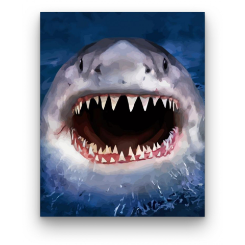 Cápa fogai - számfestő készlet – 40×50 cm (Keret nélkül) A kép izgalmas és adrenalinnal teli hangulatot áraszt, amely megragadja a néző figyelmét. Egy történet bontakozik ki a mélység titkairól, ahol a természet ereje uralkodik. A kék és szürke árnyalatok