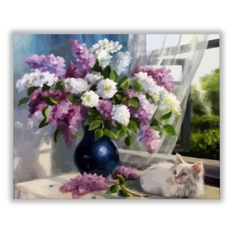 Cica az orgona mellett - számfestő készlet – 40×50 cm (Keret nélkül) A festmény nyugodt, idilli hangulatot áraszt, amely a természet csendes szépségét idézi. Egy meghitt pillanatot ragad meg, ahol az orgonák és a cica közötti kapcsolat mesél a tavasz érke
