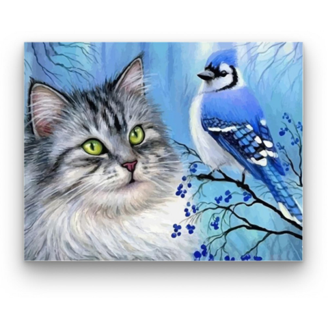 Cica és kék madár - számfestő készlet – 40×50 cm (Keret nélkül) Készíts gyönyörű műalkotásokat, előzetes festő tudás nélkül! Éld át az alkotás gyönyörű pillanatait és varázslatos hangulatát! Akkor is gyönyörű festményeket hozhatsz létre, ha még nem festet