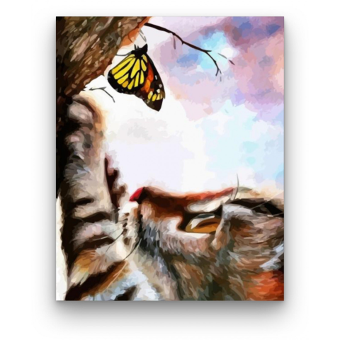 Cica és pillangó - számfestő készlet – 40×50 cm (Keret nélkül) Készíts gyönyörű műalkotásokat, előzetes festő tudás nélkül! Éld át az alkotás gyönyörű pillanatait és varázslatos hangulatát! Akkor is gyönyörű festményeket hozhatsz létre, ha még nem festett