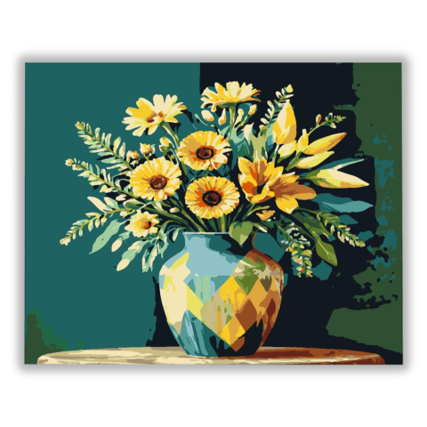 Citromfény kompozició - számfestő készlet – 40×50 cm (Keret nélkül) Ez a festmény egy csendes reggel hangulatát idézi, ahol a nap első sugarai aranyló fénybe burkolják a virágok szirmait. Egy történet bontakozik ki, amelyben a természet és az otthon meleg