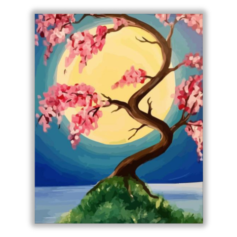 Cseresznyevirág a holdfényben - számfestő készlet – 40×50 cm (Keret nélkül) A festmény varázslatos éjszakai hangulatot áraszt, amely megnyugtatja a lelket. Egy titokzatos történet bontakozik ki a cseresznyevirágok és a fénylő holdfény között. A vibráló ké