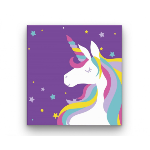 Csillagos Unikornis 2 - gyerek számfestő készlet – 20×20 cm (Keret nélkül) Ez a kép egy álmodozó unikornist ábrázol, aki a csillagokkal teli éjszakai égbolton lebeg. A szivárványos sörény és a vidám lila háttér varázslatos hangulatot áraszt. Tökéletes vál