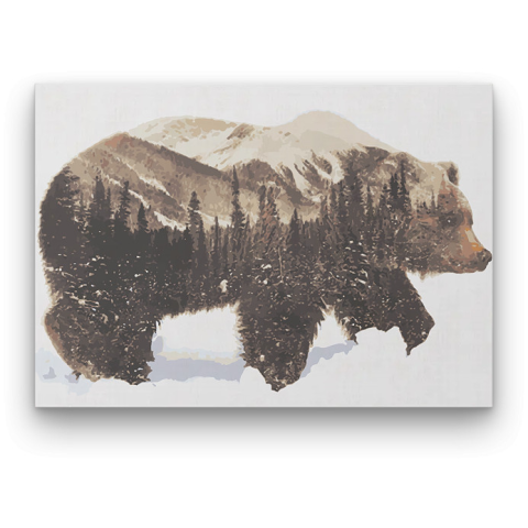 Csodálatos Medve - számfestő készlet – 40×50 cm (Keret nélkül) Ez a festmény egy varázslatos téli tájat idéz meg, ahol a természet és az állatok harmóniája elevenedik meg. A kép közepén egy medve sziluettje rejti magában a hegyek és fenyvesek csendes tört