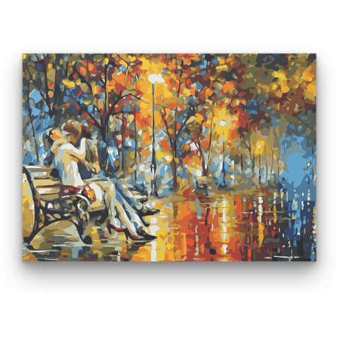 Csók a Padon - számfestő készlet – 40×50 cm (Keret nélkül) A festmény meghitt, romantikus hangulatot áraszt, amely egy esős éjszaka varázsát idézi. Egy titokzatos történet bontakozik ki a padon ülő pár körül, akiket a lámpafények és az őszi fák színes kav