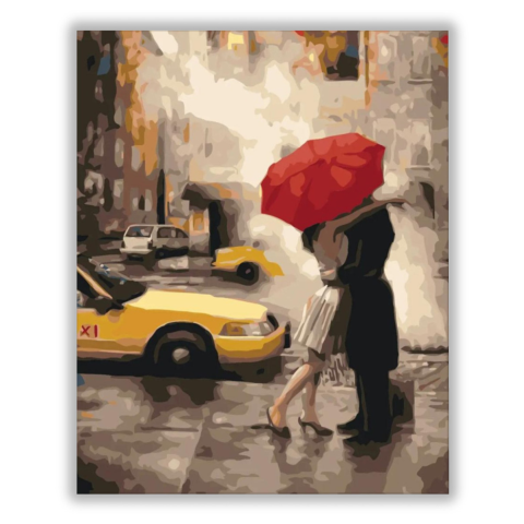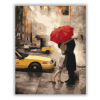 Csók a piros esernyő alatt - számfestő készlet – 40×50 cm (Keret nélkül) A festmény egy esős városi utca romantikus pillanatát ragadja meg, ahol a piros esernyő alatt rejtőző pár egymásra talál. A háttérben elmosódott taxi és ködös épületek sejtetik a nyü