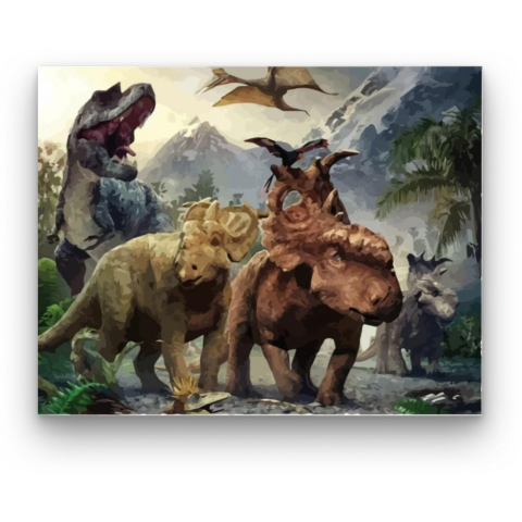 Dinók - számfestő készlet – 40×50 cm (Keret nélkül) Ez a festmény egy izgalmas kalandot tár elénk a dinoszauruszok világában, ahol az ősi lények életre kelnek. A kép mesél egy távoli korszakról, ahol a természet uralta a földet, és minden sarkon új csodák