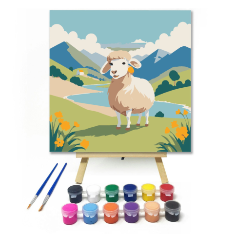 Dombos hegyeknél - gyerek számfestő készlet – 20×20 cm (Keret nélkül) Ez a kép egy vidám kis bárányt ábrázol, aki boldogan legelészik a dombos hegyek között. A zöld rétek és a kék égbolt mesés hátteret varázsolnak a festéshez. Tökéletes választás a gyerek