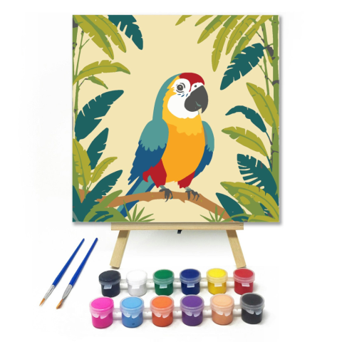 Dzsungel színpompája - gyerek számfestő készlet – 20×20 cm (Keret nélkül) Ez a kép egy színpompás papagájt ábrázol, aki épp egy faágon pihen a dzsungel közepén. A ragyogó zöld és narancssárga színek életre keltik a vidám dzsungel hangulatát. Tökéletes vál