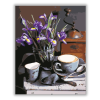 Egy csésze kávé - számfestő készlet – 40×50 cm (Keret nélkül) A festmény csendes, meghitt hangulatot áraszt, amely a reggeli kávézás nyugalmát idézi. Egy történet bontakozik ki a kép mögött, ahol a mindennapok apró örömei kerülnek előtérbe. A lila virágok
