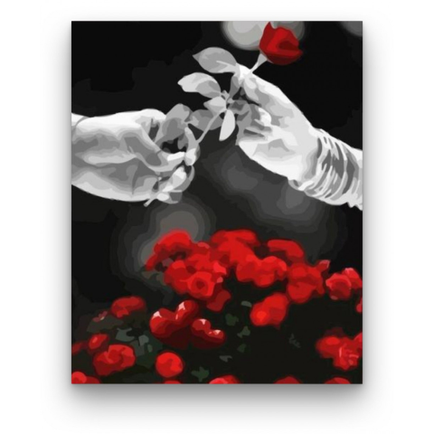 Egy szál rózsa neked - számfestő készlet – 40×50 cm (Keret nélkül) A festmény egy finom, romantikus pillanatot ragad meg, amely tele van érzelemmel és intimitással. A kép története a szeretet és ajándékozás gesztusa köré fonódik, ahol két kéz találkozik e