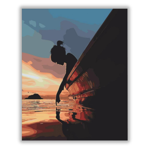Egyedül a tavon - számfestő készlet – 40×50 cm (Keret nélkül) A festmény nyugodt, melankolikus hangulatot áraszt, mintha egy csendes pillanatot örökítene meg a természet ölelésében. Egy magányos alak érintése a vízen mesél az elmúlt napokról és a jövő ígé