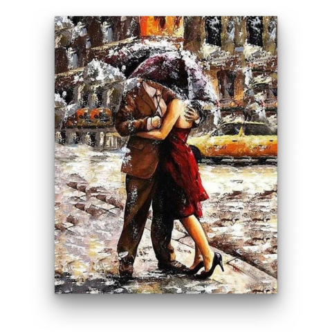Együtt az Esőben - számfestő készlet – 40×50 cm (Keret nélkül) A festmény bensőséges hangulatot áraszt, mintha a világ megállna egy pillanatra az esőben. Egy romantikus történet bontakozik ki, ahol a város zaja elhalványul két ember ölelésében. A meleg sz