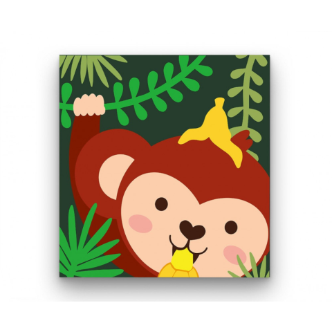 Éhes Majom - gyerek számfestő készlet – 20×20 cm (Keret nélkül) Ez a kép egy vidám kis majmocskát mutat, aki épp egy zamatos banánt falatozik a dzsungel zöldje között. A mosolygós arcocskája és a játékos színek igazi kalandra hívják a gyerekeket! Tökélete