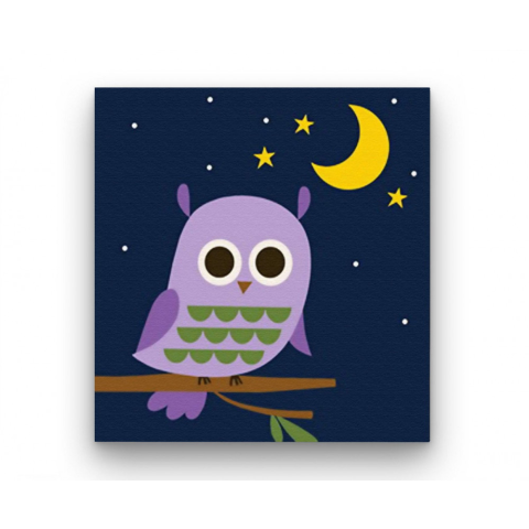 Éjszakai Bagoly - gyerek számfestő készlet – 20×20 cm (Keret nélkül) Ez a kép egy kedves, lila bagolykát ábrázol, aki éjszaka üldögél egy ágon, csillagok és a sárga hold társaságában. A sötét ég és a vidám színek kombinációja varázslatos hangulatot teremt