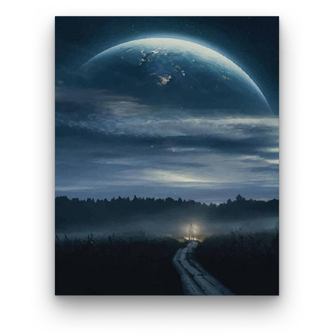 Éjszakai kilátás - számfestő készlet – 40×50 cm (Keret nélkül) Ez a festmény misztikus és nyugodt hangulatot áraszt, mintha egy másik világba kalauzolna. Egy távoli utazás történetét sugallja, ahol a természet és az univerzum találkozik. A mélykék árnyala