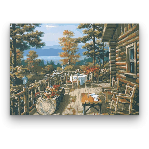Élet az Erdőben - számfestő készlet – 40×50 cm (Keret nélkül) Ez a festmény egy csendes, békés reggel hangulatát idézi, ahol a természet és az emberi kéz alkotta világ harmonikusan egyesül. A kép mesél egy pillanatról, amikor a teraszról elénk táruló táj