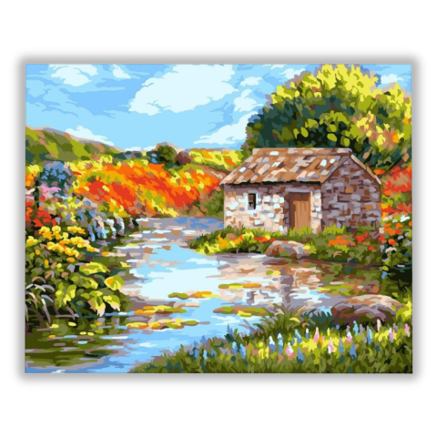 Erdei kuckó - számfestő készlet – 40×50 cm (Keret nélkül) Ez a festmény nyugalmat és harmóniát sugároz, mintha egy titkos menedéket tárna elénk az erdő mélyén. Egy kis házikó áll a vízparton, ahol az idő megállt, és csak a természet suttogása hallatszik.