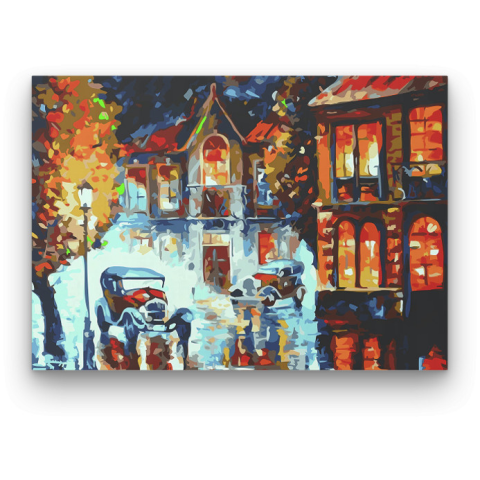 Esti Forgalom - számfestő készlet – 40×50 cm (Keret nélkül) Az esti város hangulata egyszerre titokzatos és nosztalgikus, mintha egy régi emlék elevenedne meg. A képen átsejlik egy történet a múltból, ahol az utcák csendjét csak a lámpafény és a távoli au