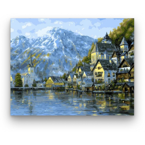 Esti táj - számfestő készlet – 40×50 cm (Keret nélkül) Ez a festmény nyugodt, békés hangulatot áraszt, amely elrepít egy távoli, mesebeli világba. A képen megelevenedő falu mintha egy rejtett történetet mesélne a múltból, ahol minden ház és utca saját tit