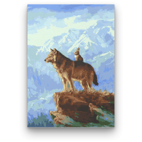 Farkas és Nyúl - számfestő készlet – 40×50 cm (Keret nélkül) A festmény egy különleges, békés harmóniát sugároz, ahogy a farkas és a nyúl együtt szemlélik a tájat. Egy elgondolkodtató történet bontakozik ki előttünk, ahol az ellentétek találkozása új pers
