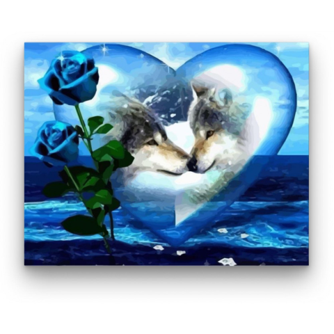 Farkas szerelem - számfestő készlet – 40×50 cm (Keret nélkül) Ez a festmény a mély érzelmek és az összetartozás hangulatát árasztja, amely egy pillanatra megállítja az időt. Két farkas szív alakú keretben találkozik, mintha egy titkos történetet mesélnéne
