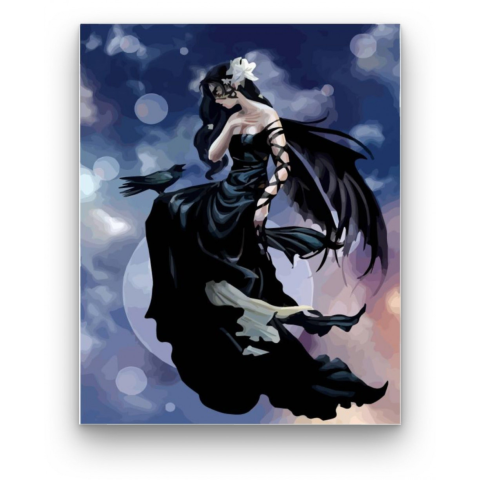 Fekete angyal - számfestő készlet – 40×50 cm (Keret nélkül) A festmény titokzatos és varázslatos légkört teremt, amely elbűvöli a nézőt. Egy történet bontakozik ki egy misztikus alak körül, aki egy holló társaságában lebeg az éjszakai égbolton. A mély kék