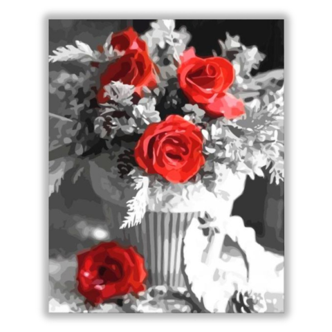 Fekete fehérben - számfestő készlet – 40×50 cm (Keret nélkül) Ez a festmény a csendes elegancia és az időtlen romantika hangulatát árasztja. A vörös rózsák kontrasztja a fekete-fehér háttérrel egy történetet mesél el a szenvedély és a nyugalom találkozásá