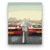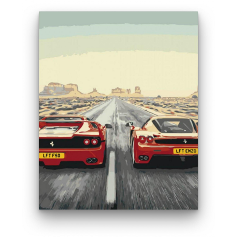 Ferrarik - számfestő készlet – 40×50 cm (Keret nélkül) Ez a festmény a sebesség és szabadság érzését kelti életre. Két ikonikus autó szeli át a végtelen utat, mintha versenyeznének az idővel. A háttérben elterülő pusztaság és az égbolt finom színei izgalm