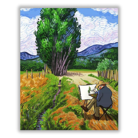 Festő - számfestő készlet – 40×50 cm (Keret nélkül) Ez a festmény megnyugtató, mégis élettel teli hangulatot áraszt. Egy magával ragadó történetet mesél el egy művészről, aki a természet közepén találja meg inspirációját. A vibráló zöldek és az ég kékje h