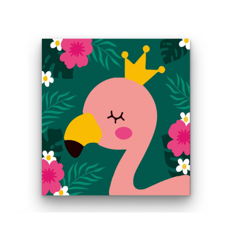 Flamingó Király - gyerek számfestő készlet – 20×20 cm (Keret nélkül) Ez a kép egy koronás flamingót ábrázol, aki büszkén trónol a dzsungel színes virágai között. A rózsaszín és zöld árnyalatok vidám hangulatot árasztanak. Tökéletes választás a gyerekek el