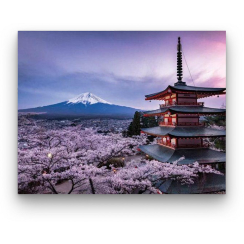 Fuji Hegy - számfestő készlet – 40×50 cm (Keret nélkül) A festmény megnyugtató harmóniát áraszt, ahogy a távoli hegyek és a cseresznyefák virágzása összefonódik. A kép mesébe illő történetet mesél el egy időtlen pillanatról, ahol a természet és az ember a
