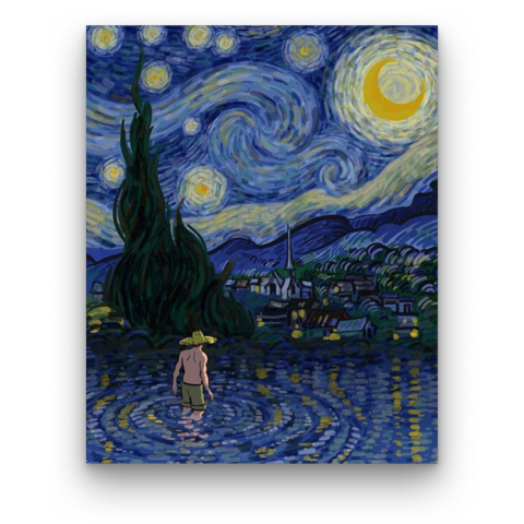 Fürdőzés éjjel - számfestő készlet – 40×50 cm (Keret nélkül) Ez a festmény misztikus éjszakai hangulatot áraszt, ahol a csillagok tánca varázslatos történetet mesél el. A kompozícióban egy magányos figura merül el a hullámzó vízben, mintha az univerzum ti