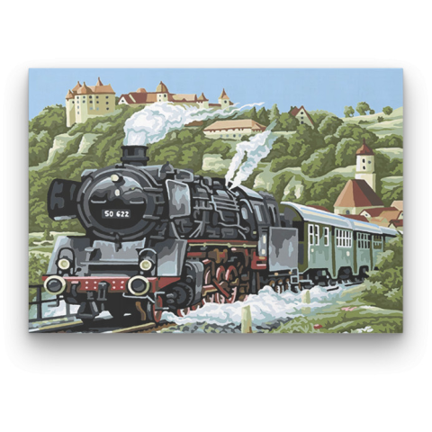 Gőzmozdonyos Vonat - számfestő készlet – 40×50 cm (Keret nélkül) Ez a festmény egy nosztalgikus utazásra hív, ahol a gőzmozdony füstje az időtlen táj felett kanyarog. A kép mesés történetet sugall egy vidéki kalandról, ahol a vonat magával ragadja a nézőt
