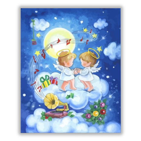 Gyermek angyalkák - számfestő készlet – 40×50 cm (Keret nélkül) A festmény álomszerű, békés hangulatot áraszt, amely elvarázsolja a nézőt. Két angyalka lebeg a felhők között, mintha egy mesebeli dallamot követnének az éjszakai égbolt alatt. A kék és sárga