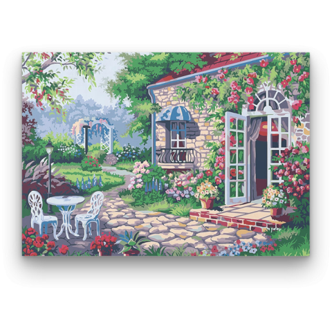 Gyönyörű Kert - számfestő készlet – 40×50 cm (Keret nélkül) A festmény egy békés, idilli kert hangulatát árasztja, amely az otthon melegét és nyugalmát idézi. A kép mesél egy helyről, ahol a természet és az ember alkotta világ harmonikusan találkozik. A s