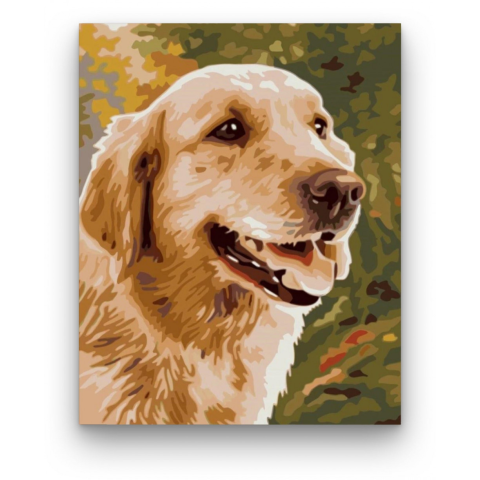 Gyönyörű kutya - számfestő készlet – 40×50 cm (Keret nélkül) A festmény melegséggel és boldogsággal tölti meg a szobát, ahogy a kutya barátságos tekintete mosolyt csal az arcodra. Egy történet bontakozik ki a kép mögött, ahol a hűség és szeretet örök emlé