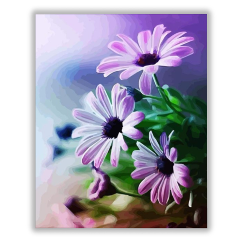 Gyönyörű lila kamilla - számfestő készlet – 40×50 cm (Keret nélkül) A festmény lila kamillái nyugalmat és harmóniát sugároznak, mintha egy csendes kert titkait tárnák fel. A virágok szirmai közötti finom átmenetek egy történetet mesélnek el a természet sz
