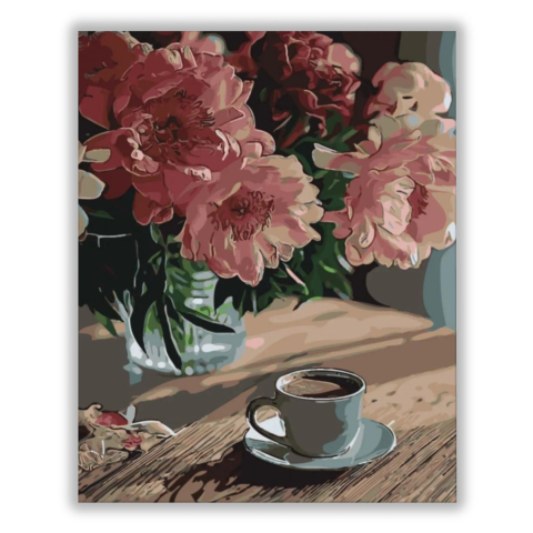 Hangulatos reggeli kávé - számfestő készlet – 40×50 cm (Keret nélkül) A kép nyugodt és meghitt hangulatot áraszt, mintha egy csendes reggel pillanatait örökítené meg. Egy történet bontakozik ki a kávé és virágok között, amely a pihenés és feltöltődés öröm