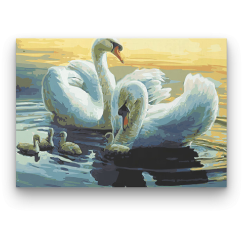 Hattyúcsalád - számfestő készlet – 40×50 cm (Keret nélkül) A kép nyugodt harmóniát áraszt, ahogy a hattyúk családja békésen úszik a vízen. Egy történet bontakozik ki a néző előtt, ahol az élet szépsége és egyszerűsége találkozik. A meleg sárga és hűvös ké