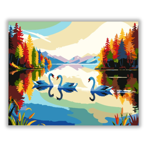 Hattyúk a Tavon - húsvéti számfestő készlet – 40×50 cm (Keret nélkül) A festmény varázslatos nyugalmat áraszt, ahogy a hattyúk kecsesen siklanak a tükörsima víz felszínén. Egy idilli táj tárul elénk, ahol a természet csendje és harmóniája mesél el egy tör