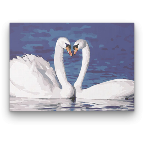 Hattyúk - számfestő készlet – 40×50 cm (Keret nélkül) A festmény békés harmóniát sugároz, ahogy a hattyúk egymás felé hajolnak. Egy csendes tóparti pillanatot idéz, ahol minden mozdulat az intimitásról mesél. A mély kék háttér kiemeli a hattyúk tiszta feh
