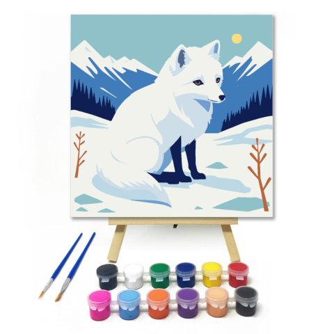 Havas hegyek között - gyerek számfestő készlet – 20×20 cm (Keret nélkül) Ez a kép egy barátságos, fehér bundás kis rókát ábrázol, aki vidáman üldögél a hófödte hegyek között. A kék és fehér színek nyugodt, téli hangulatot varázsolnak. Tökéletes választás