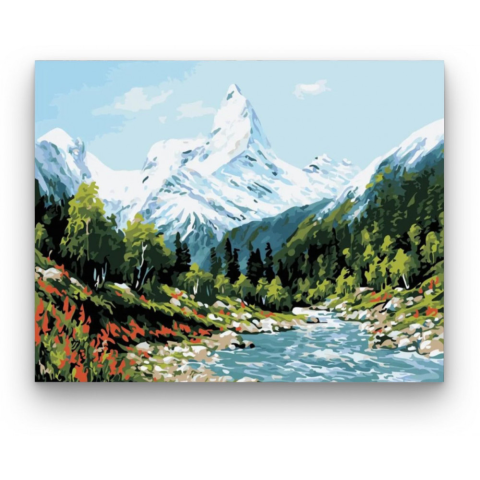 Havas tájkép - számfestő készlet – 40×50 cm (Keret nélkül) A festmény nyugodt, békés hangulatot áraszt, mintha a természet ölelésében lennénk. A kép egy eldugott völgy történetét meséli el, ahol a hófödte hegycsúcsok őrzik a csendet. A hideg és meleg szín