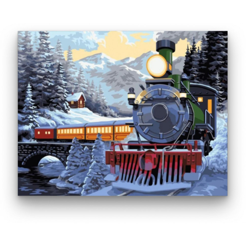Havas vonat - számfestő készlet – 40×50 cm (Keret nélkül) A festmény varázslatos téli világot tár elénk, ahol a hóval borított tájban egy magányos vonat robog keresztül. A kép mintha egy mesebeli utazásra invitálna, ahol minden kanyar mögött újabb csoda v